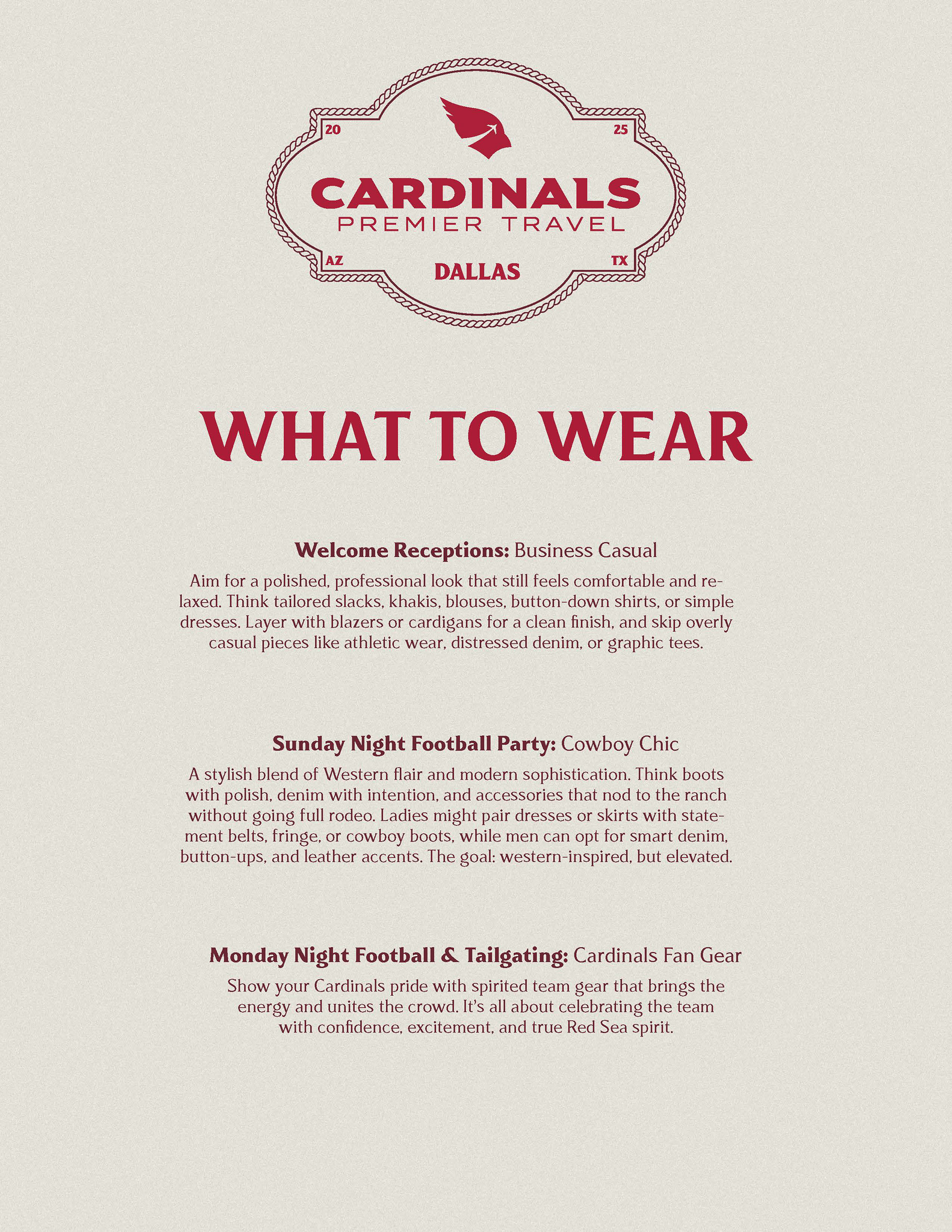 For the organization’s first-ever premier travel trip, I expanded the established Arizona Cardinals brand identity and reinterpreted it through the lens of Dallas, blending the team's visual language with a refined, modern Western aesthetic. I designed a full suite of materials including itineraries, signage, gifting elements, and event assets, creating a cohesive look and feel that matched the elevated tone of the experience while honoring both the Cardinals brand and the character of the city.